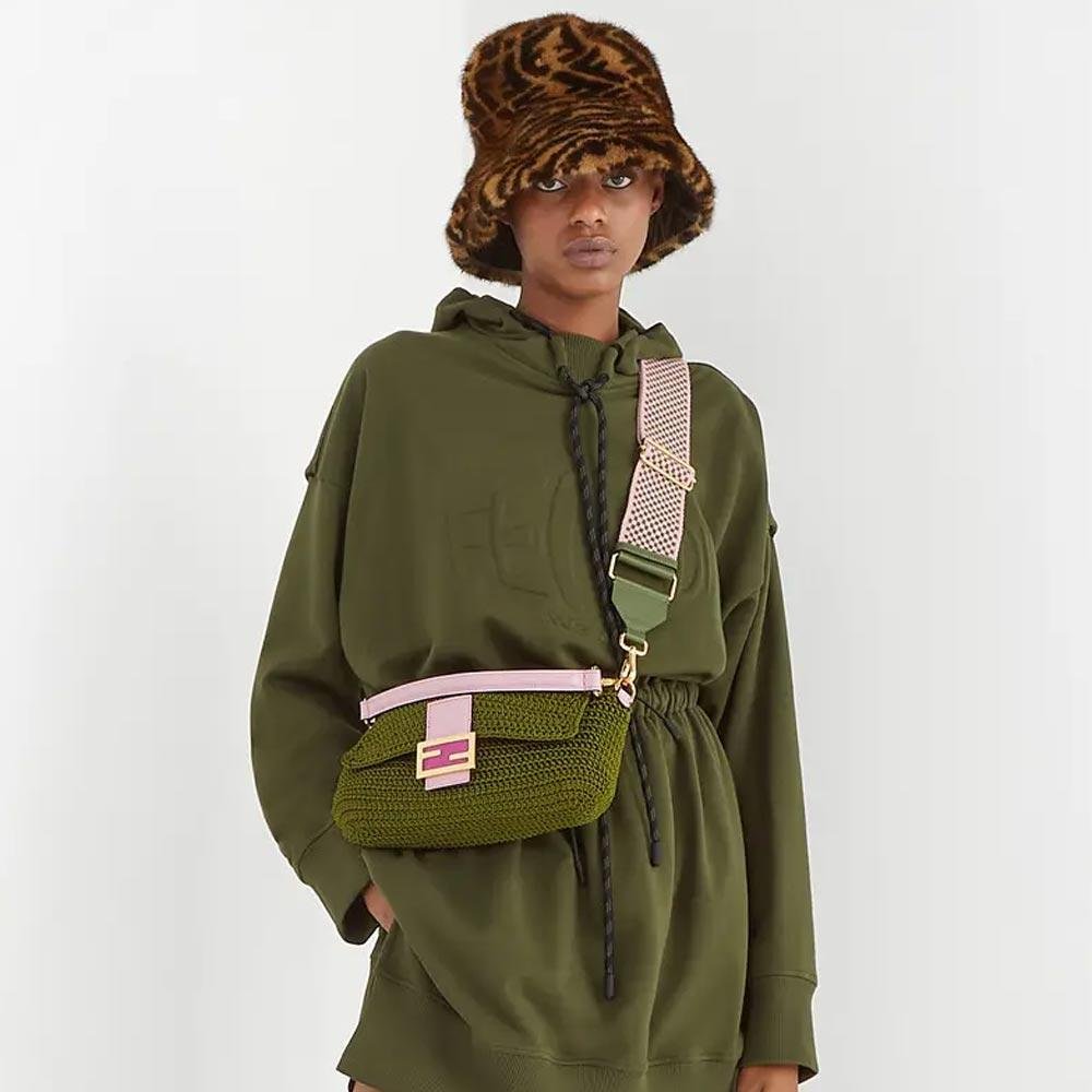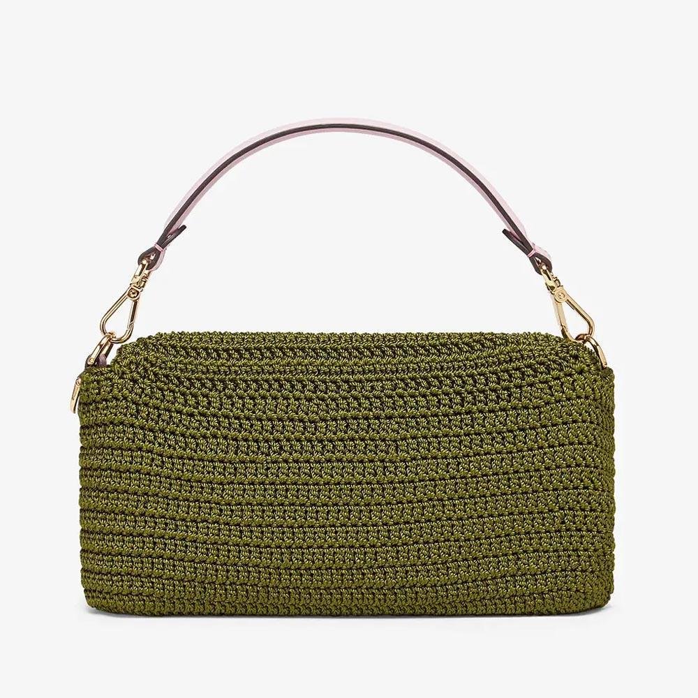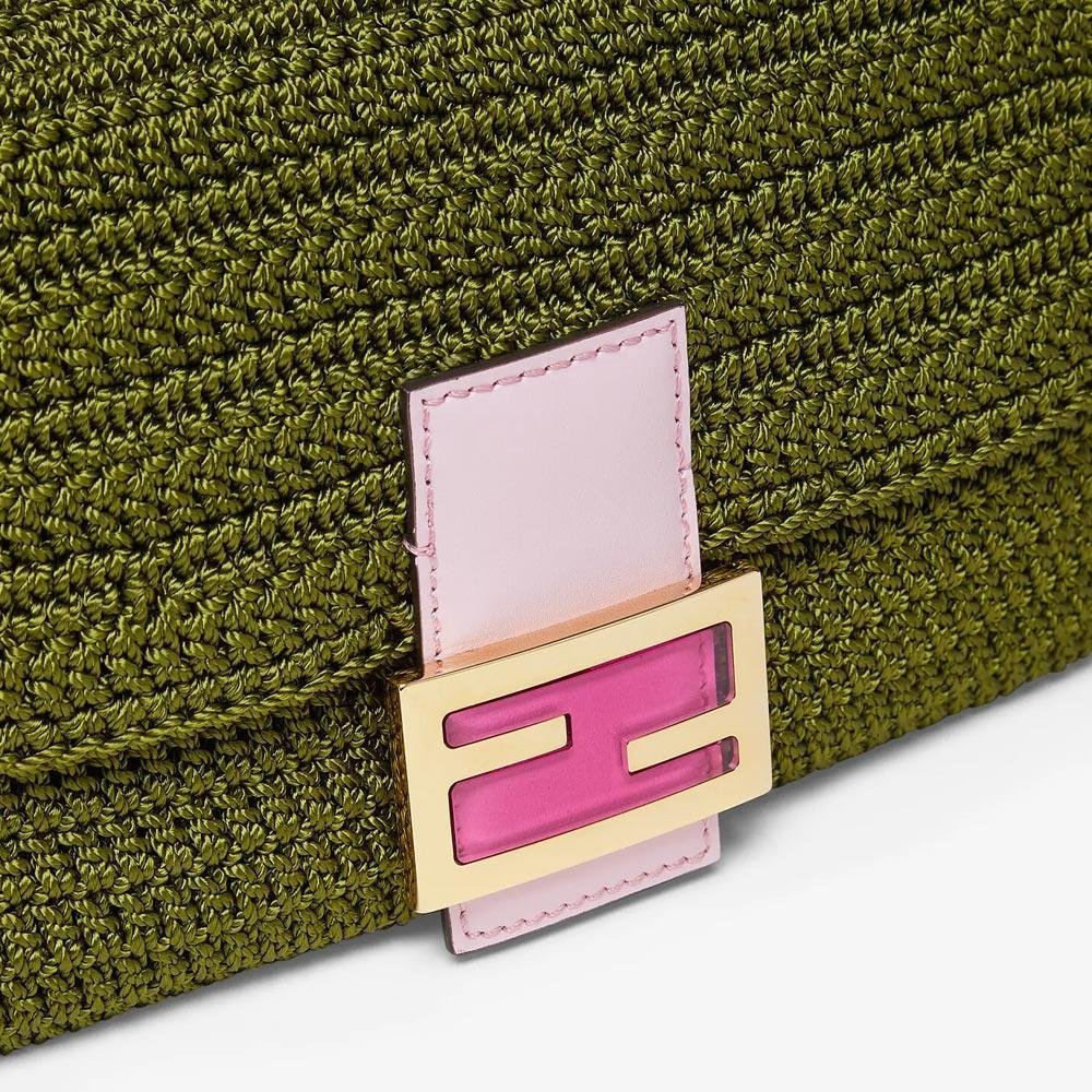 Medium iconic Baguette bag in traditional green cotton crochet. Embellished with an FF fastening with pink plexiglass details.
