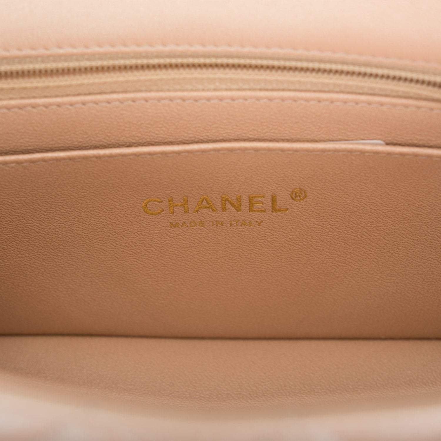 The interior is lined in beige leather and features a zipper pocket with Chanel pull and an open pocket below.