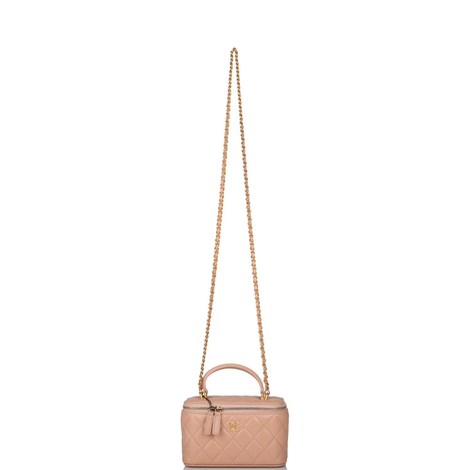 This Vanity Case is in beige lambskin with antique gold tone hardware and features a CC logo on the front, a top handle, and an interwoven antique gold tone chain link with beige leather shoulder strap.