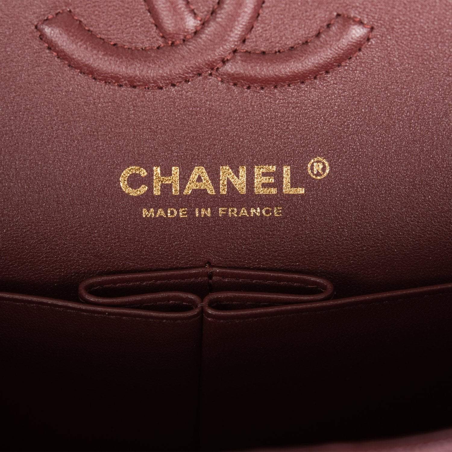This Small Classic Double Flap bag is in burgundy caviar leather with light gold tone hardware and features a front flap with signature CC turnlock closure, half moon back pocket, and adjustable interwoven light gold tone chain link and burgundy leather shoulder strap.