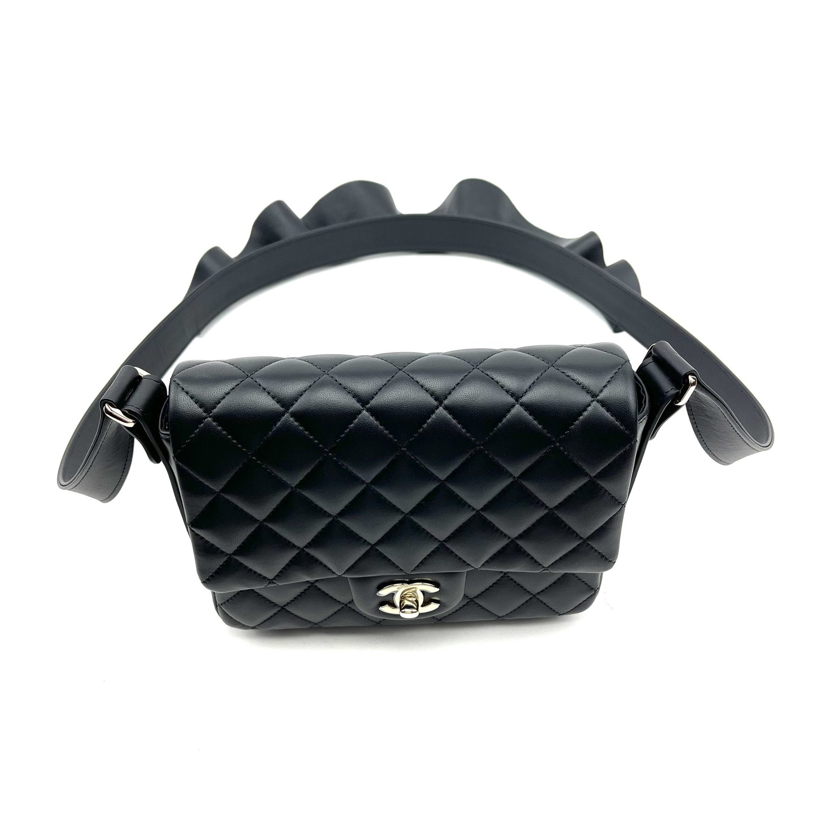 This stylish shoulder bag is beautifully crafted of diamond quilted black calfskin leather. The bag features a leather shoulder strap with a matching leather ruffle. The gold turn-lock opens to a matching leather interior with zipper and patch pockets. Includes dust cover, authenticity card, and box. Production date 2020
