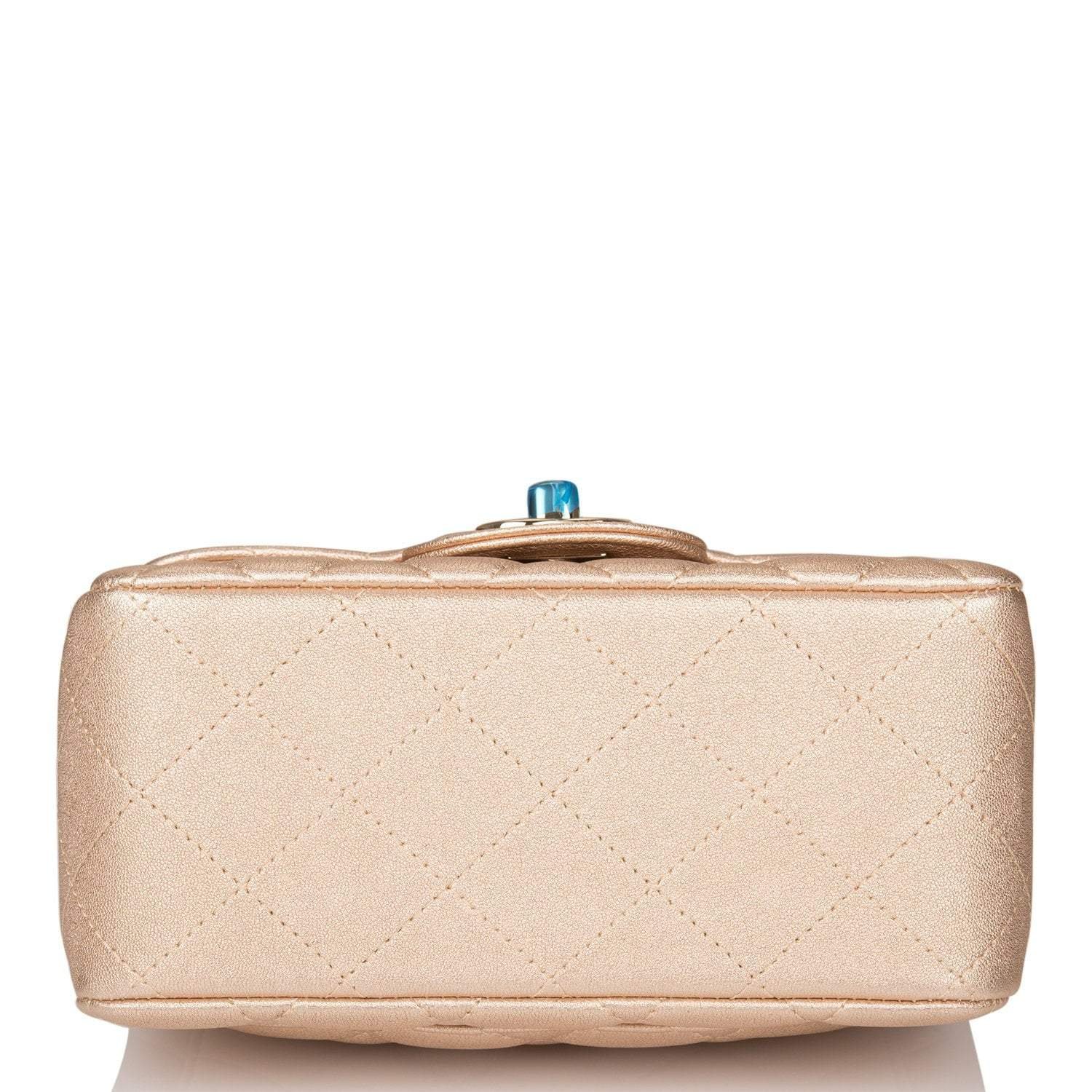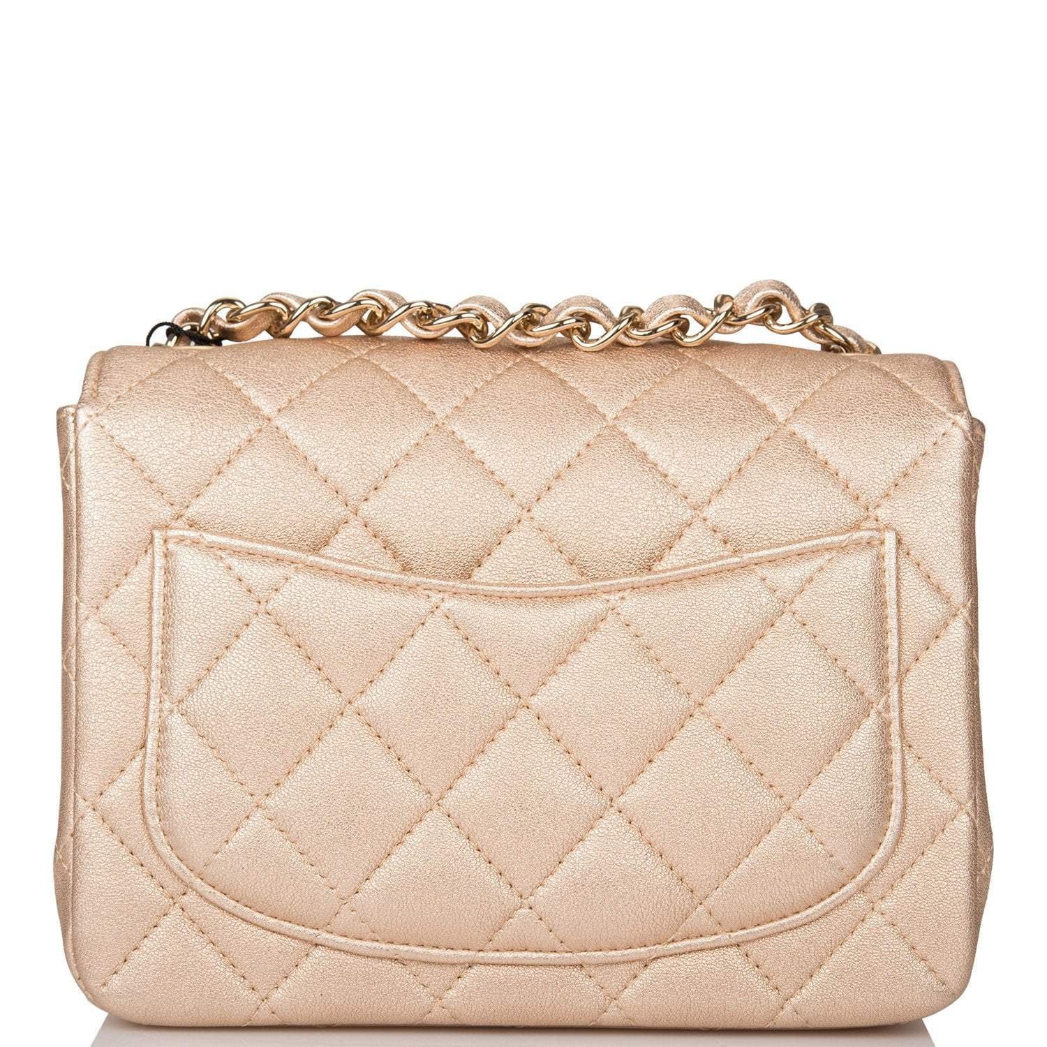 This Mini Square flap bag is in gold metallic lambskin with light gold tone hardware and has a front flap with signature CC turnlock closure, rear half moon pocket and single interwoven gold leather and light gold tone chain link shoulder/crossbody strap.