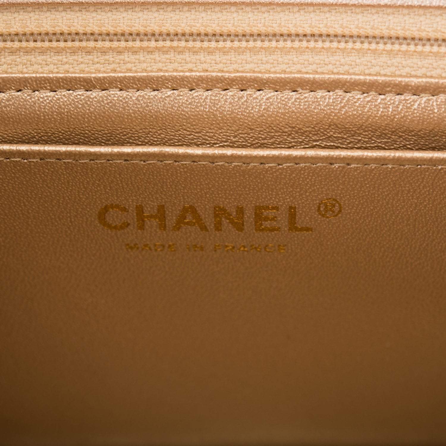 The interior is lined in gold leather and features a zipper pocket with Chanel pull and an open pocket below.
