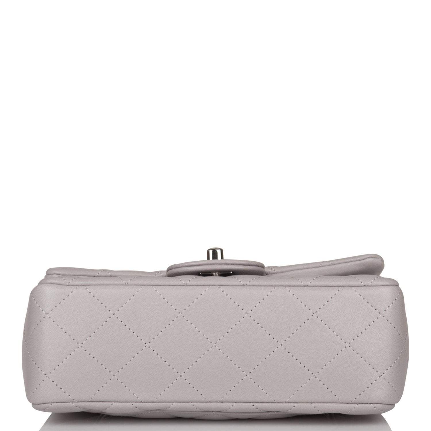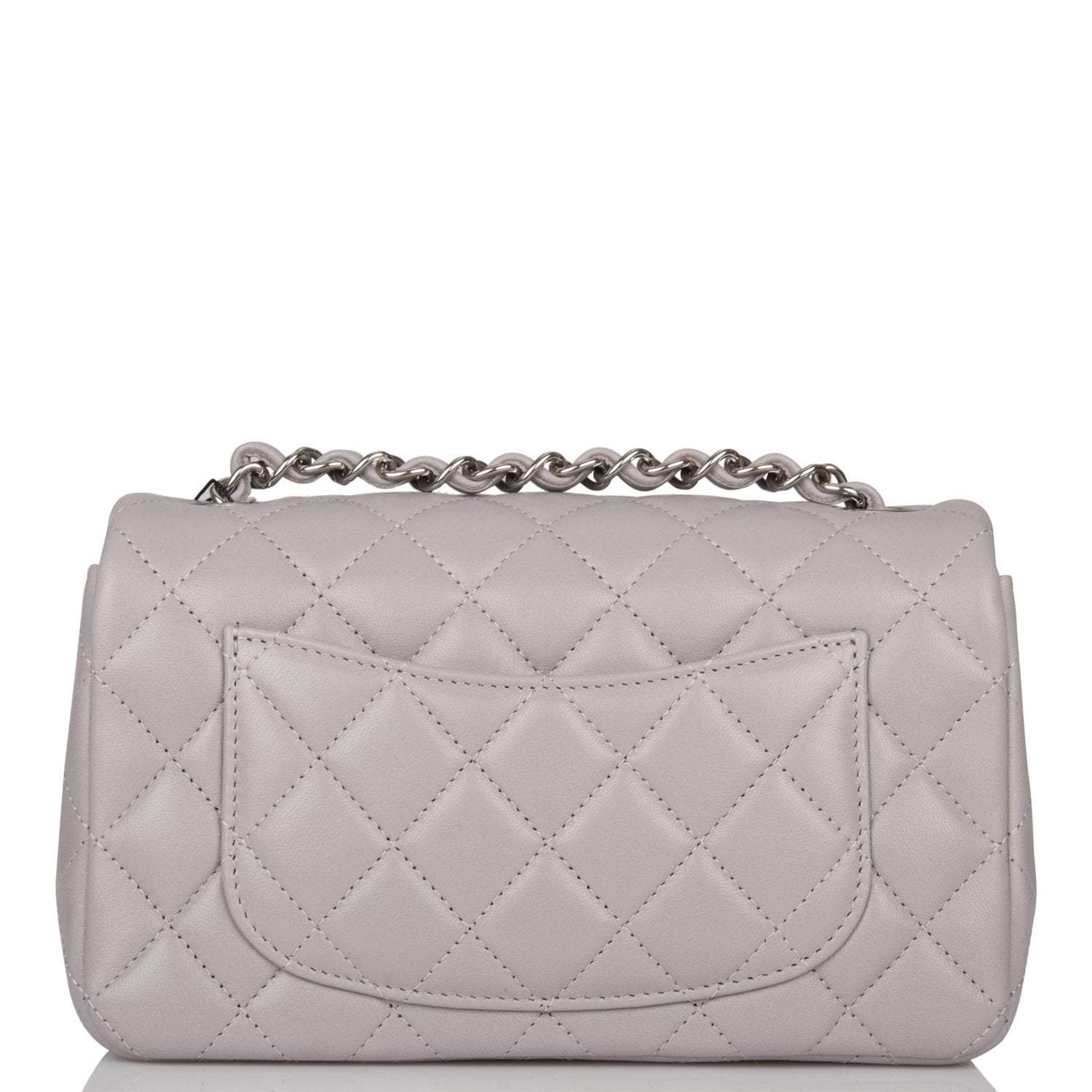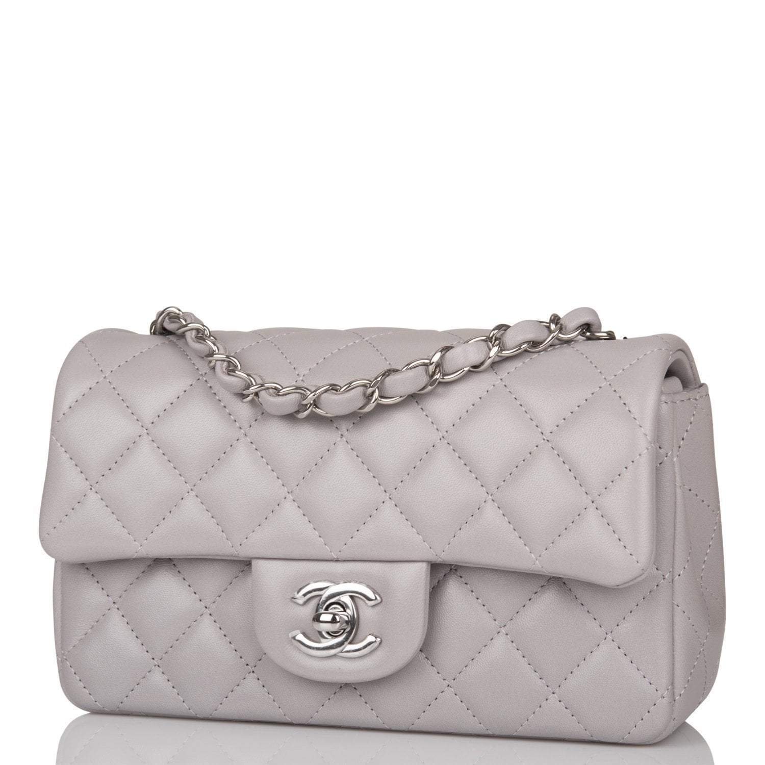 This Mini Rectangular flap bag is of light grey lambskin leather with silver tone hardware and has a front flap with signature CC turnlock closure, rear half moon pocket, single interwoven light grey leather and silver tone chain link shoulder/crossbody strap.
