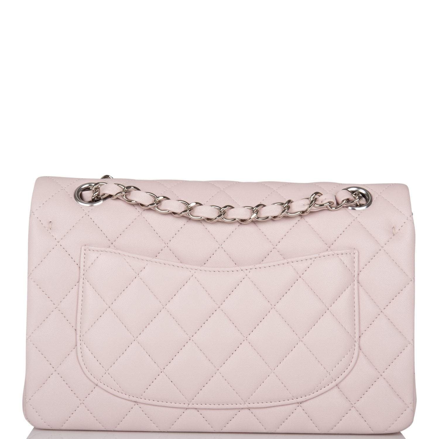 This Small Classic Double Flap bag is in light purple lambskin leather with silver tone hardware and features a front flap with signature CC turnlock closure, half moon back pocket, and adjustable interwoven silver tone chain link and light purple leather shoulder strap.