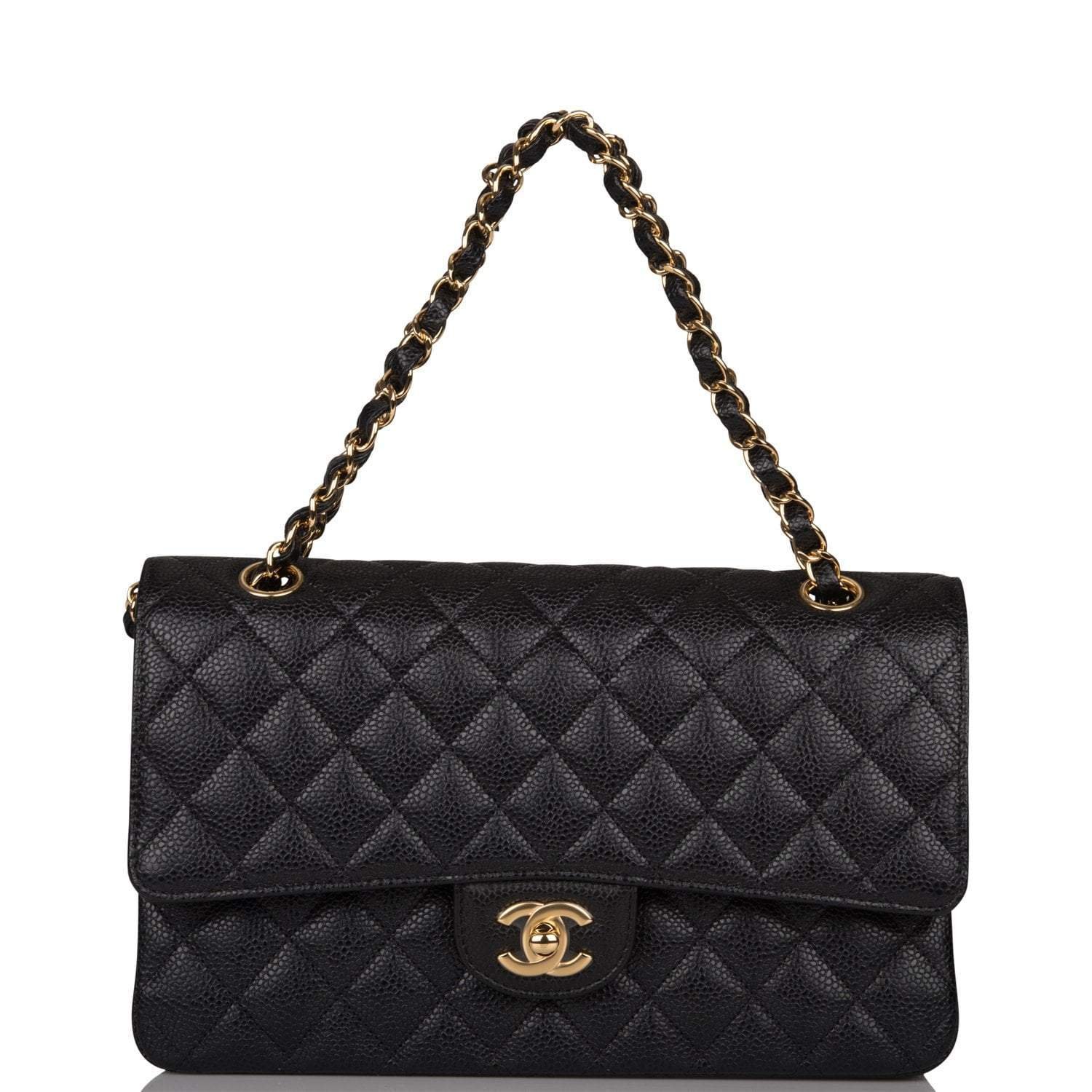 This Medium Classic Double Flap bag is in black caviar leather with gold tone hardware and features a front flap with signature CC turnlock closure, half moon back pocket, and adjustable interwoven gold tone chain link and black leather shoulder strap.