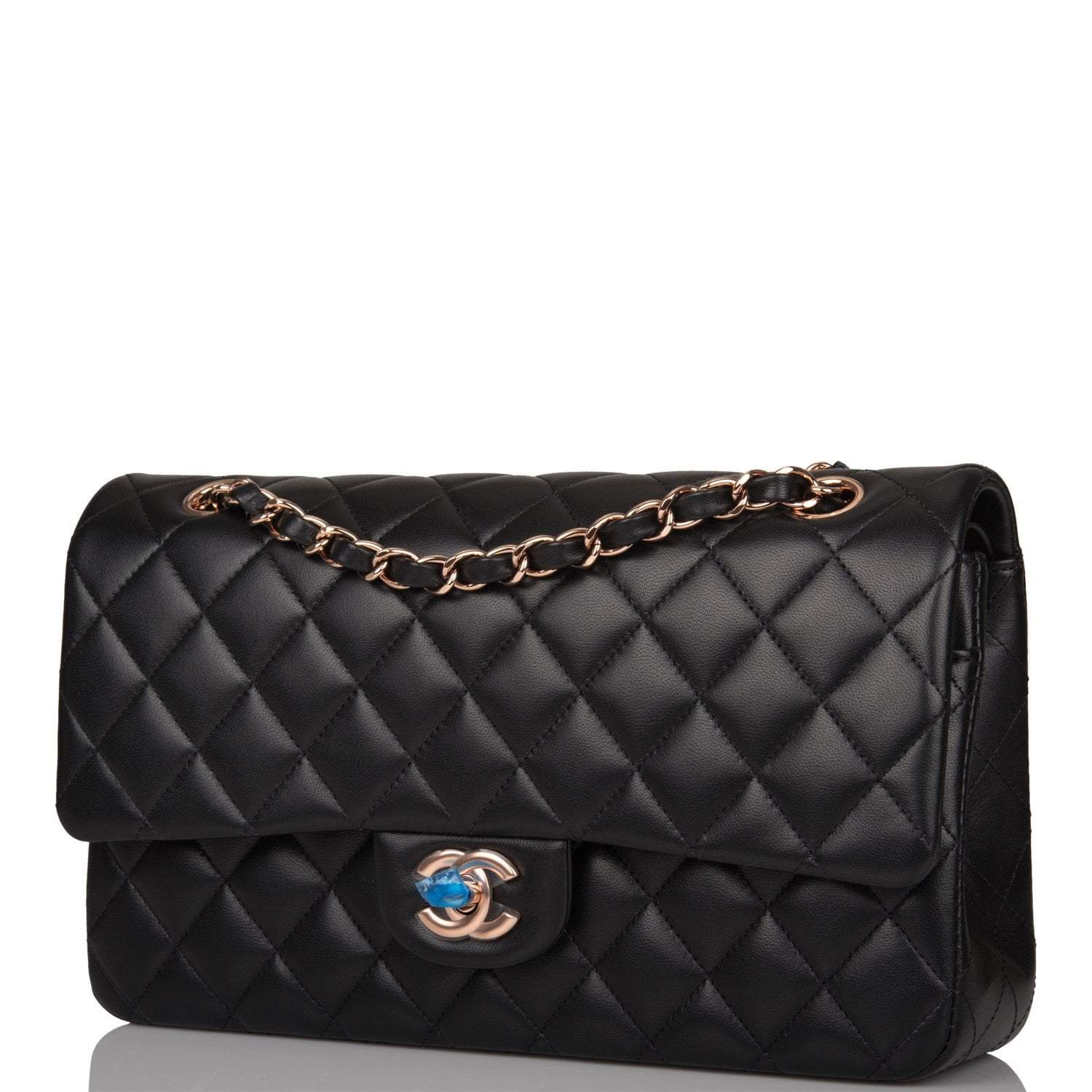This Medium Classic Double Flap bag is in black lambskin leather with rose gold tone hardware and features a front flap with signature CC turnlock closure, half moon back pocket, and adjustable interwoven rose gold tone chain link and black leather shoulder strap.