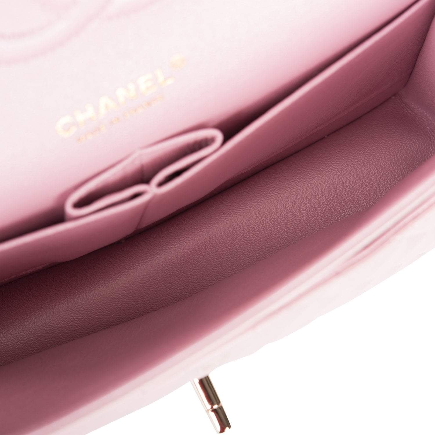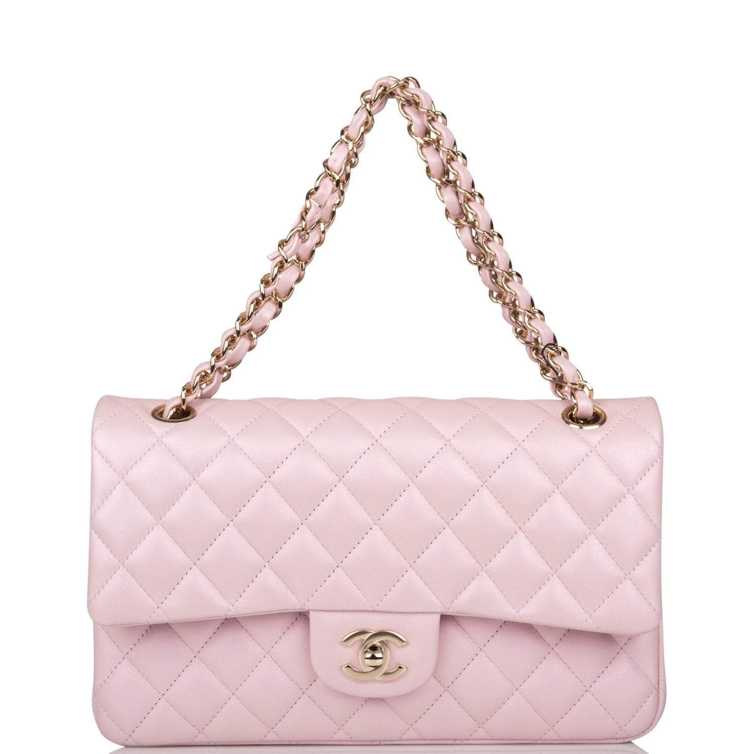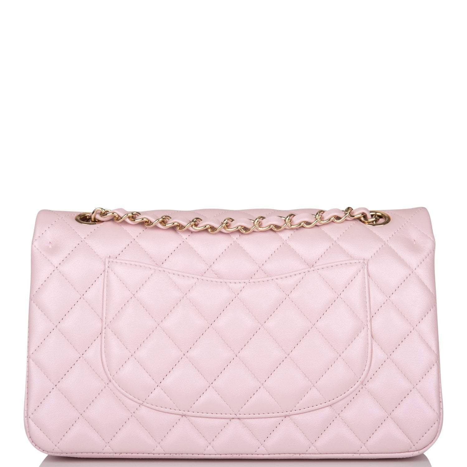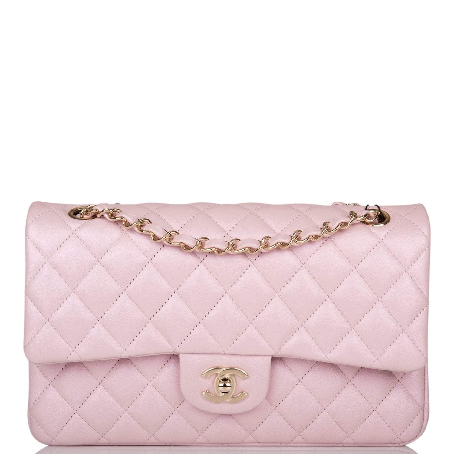 This Medium Classic Double Flap bag is in pink iridescent lambskin leather with light gold tone hardware and features a front flap with signature CC turnlock closure, half moon back pocket, and adjustable interwoven light gold tone chain link and pink leather shoulder strap.