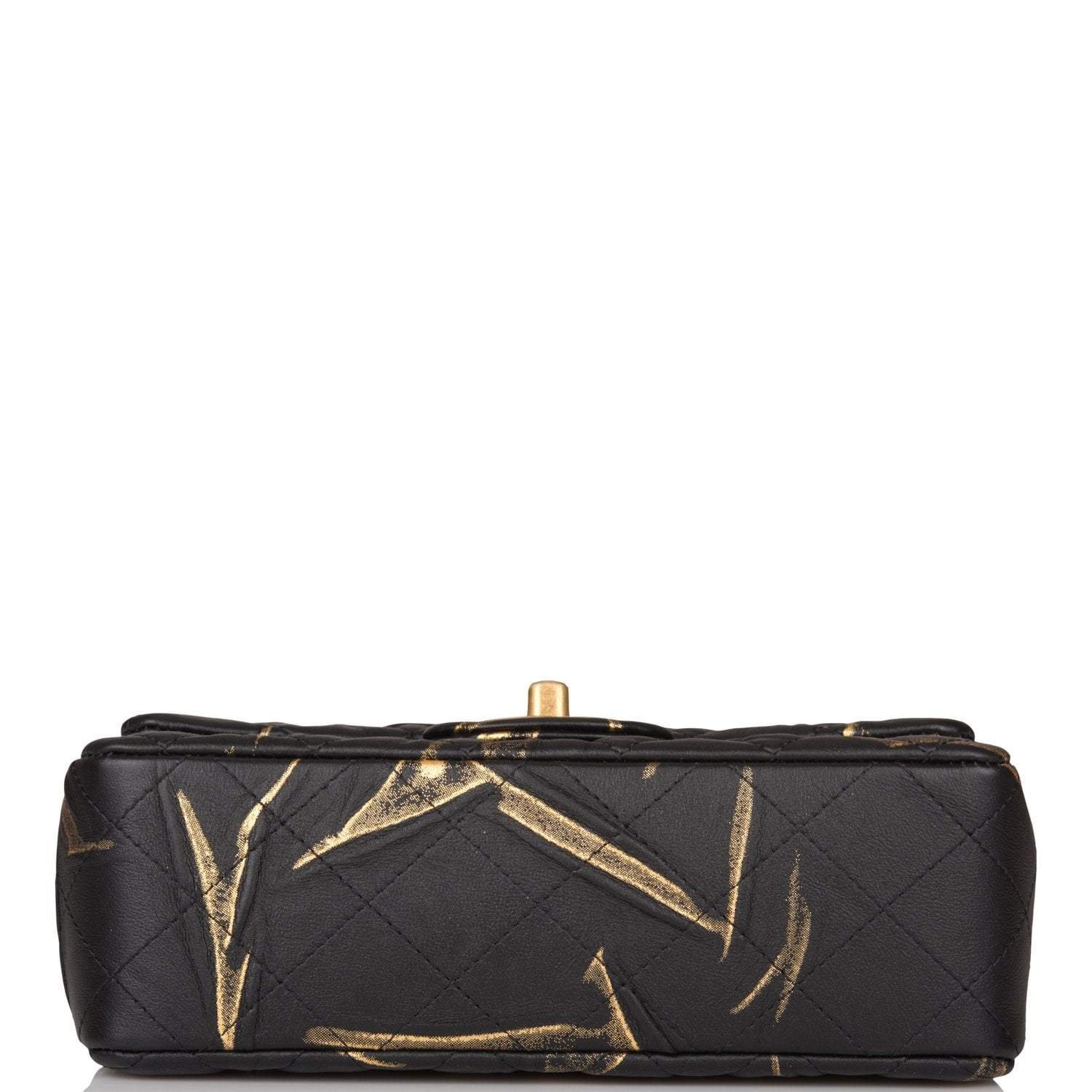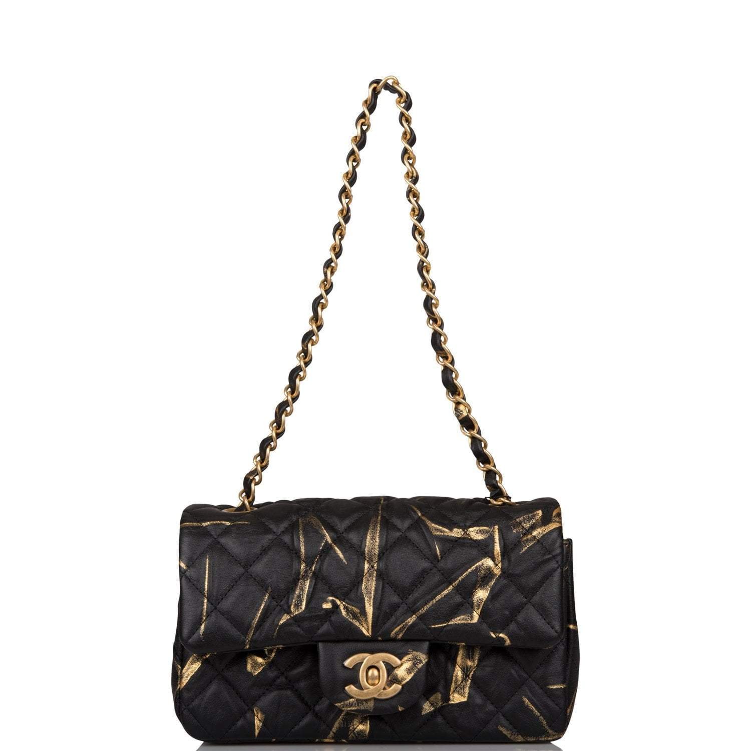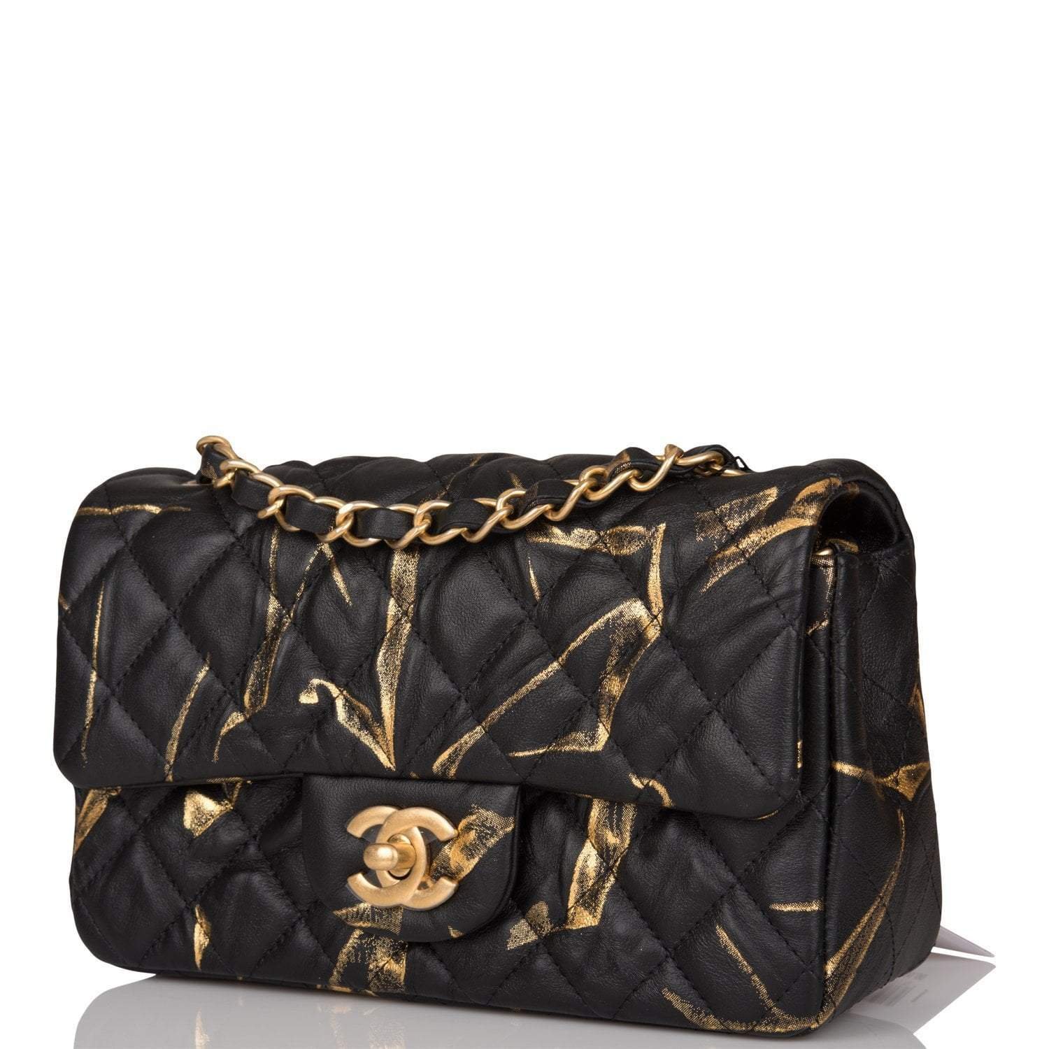 This Mini Rectangular flap bag is in black and gold aged calfskin with antique gold tone hardware and has a front flap with signature CC turnlock closure, rear half moon pocket and single interwoven black leather and antique gold tone chain link shoulder/crossbody strap.