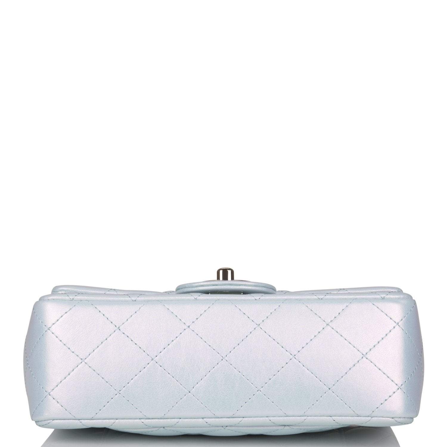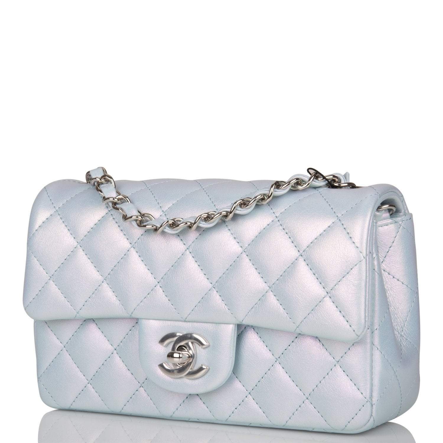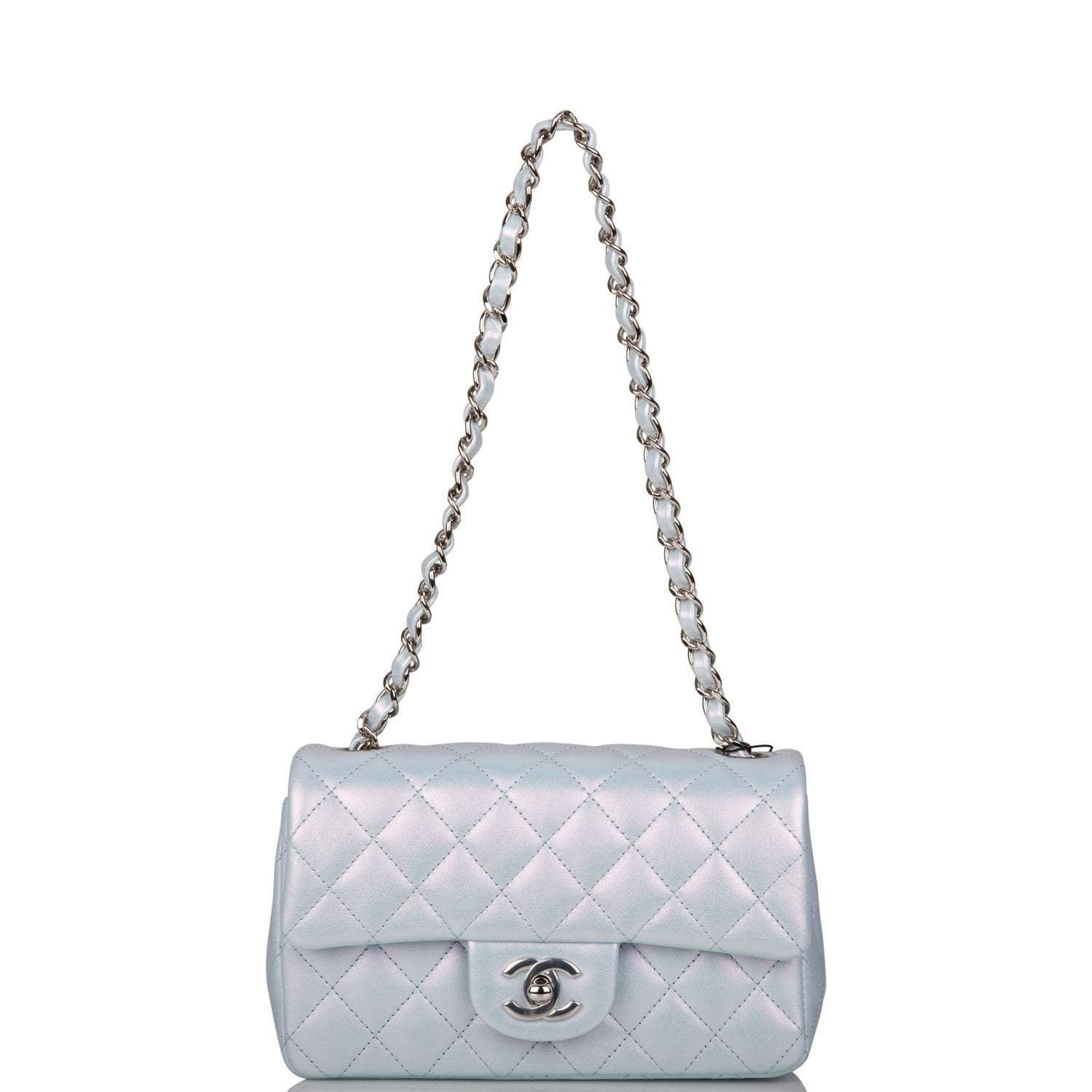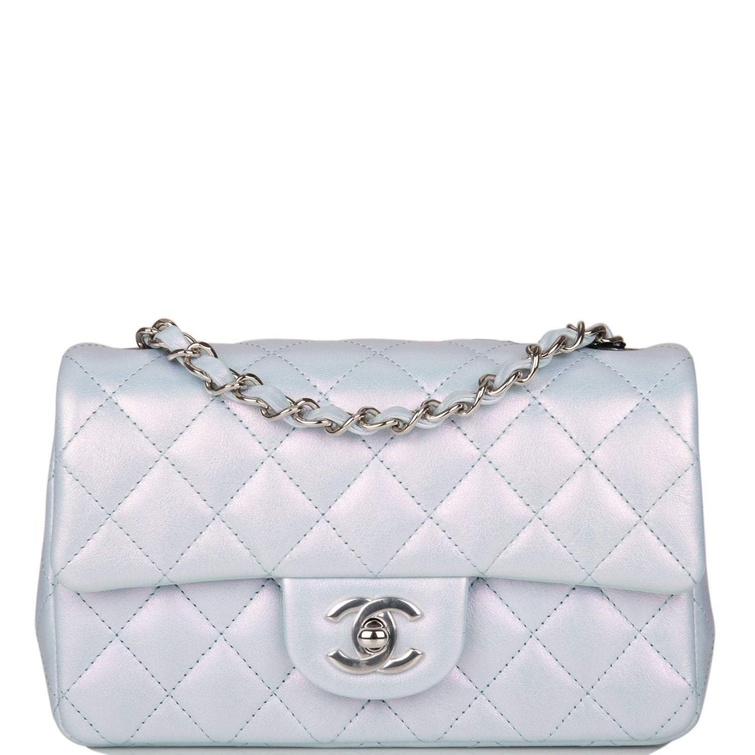 This Mini Rectangular flap bag is in blue iridescent lambskin with silver tone hardware and has a front flap with signature CC turnlock closure, rear half moon pocket and single interwoven blue leather and silver tone chain link shoulder/crossbody strap.