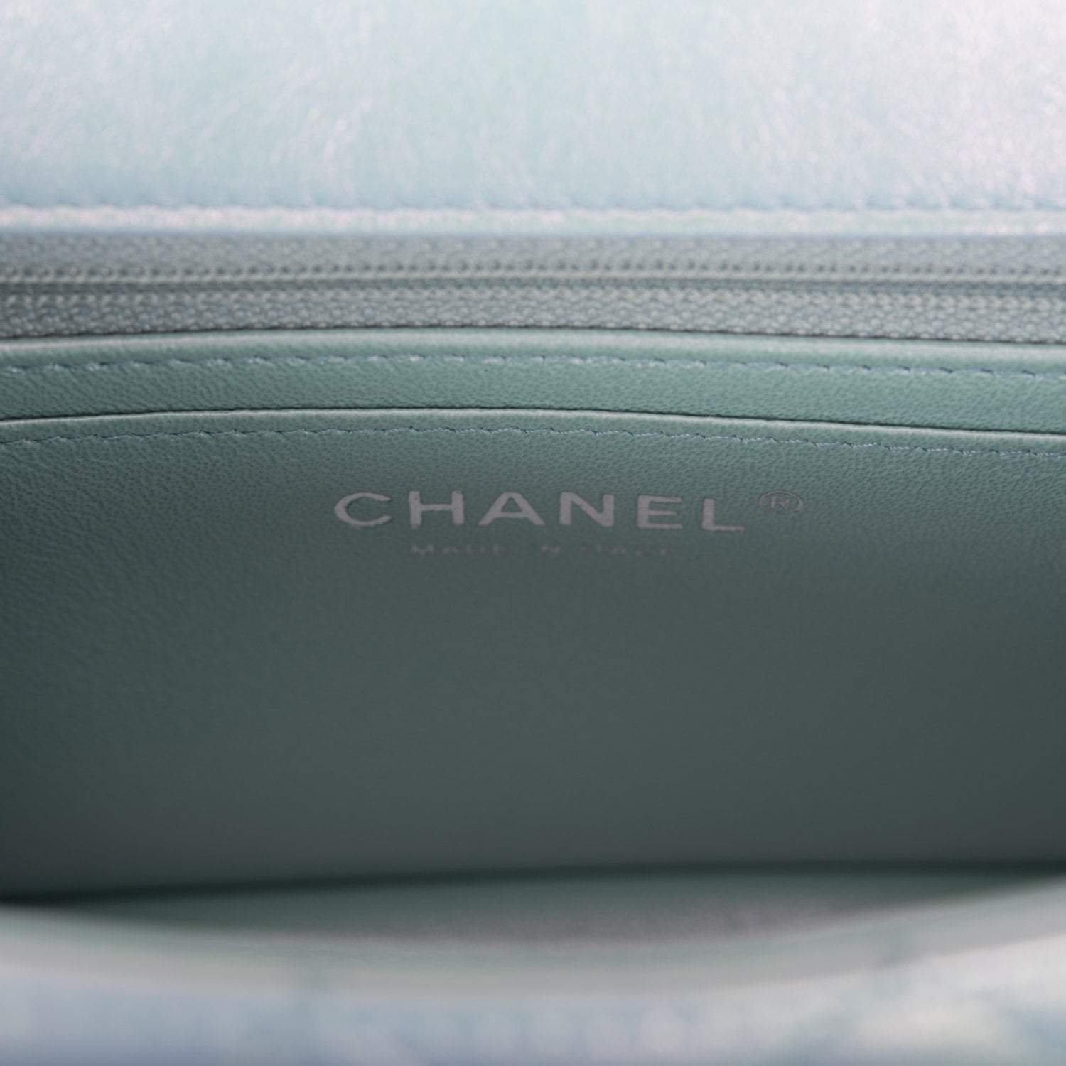 The interior is lined in blue iridescent leather and features a zipper pocket with Chanel pull and an open pocket below.