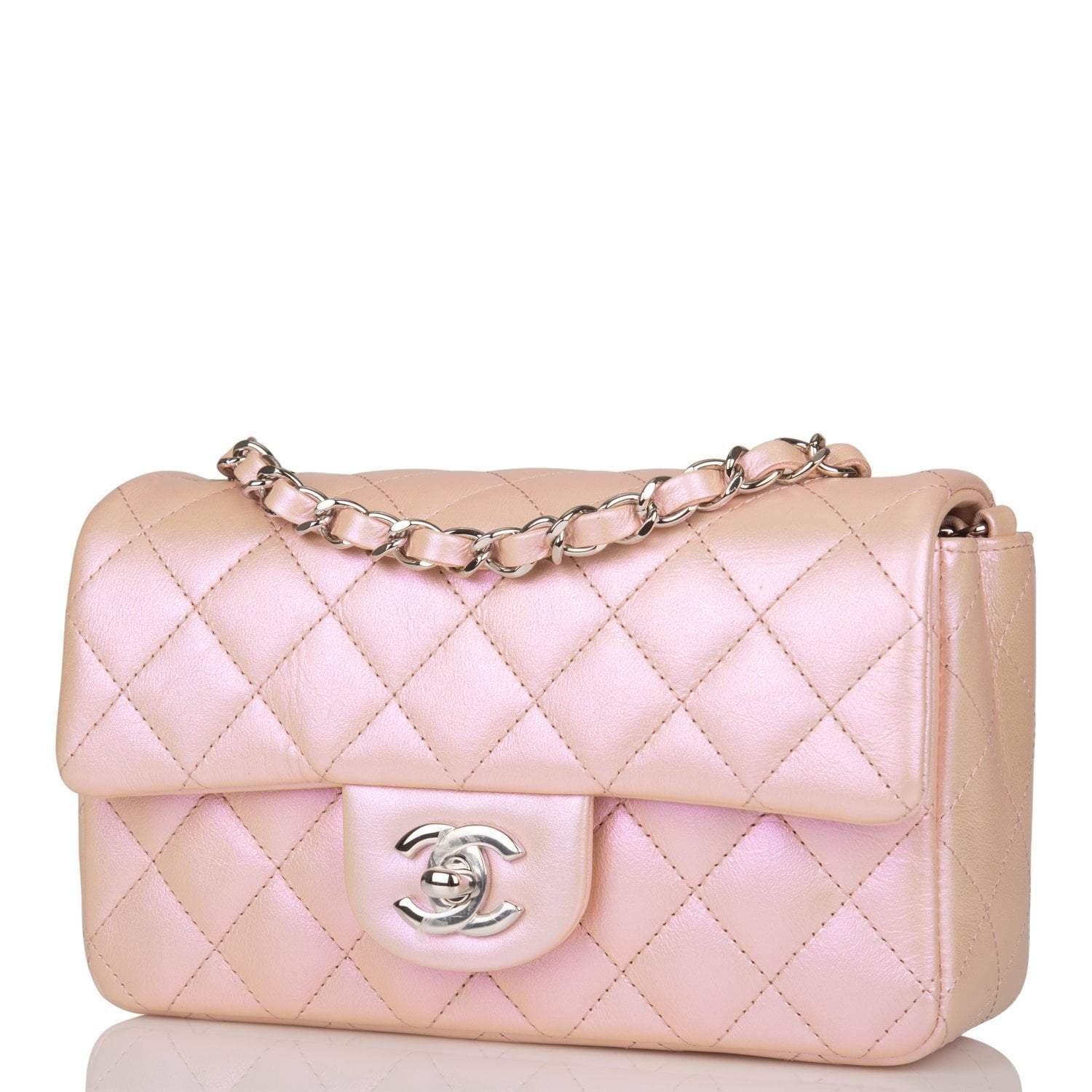 This Mini Rectangular flap bag is in pink iridescent lambskin with silver tone hardware and has a front flap with signature CC turnlock closure, rear half moon pocket and single interwoven pink leather and silver tone chain link shoulder/crossbody strap.