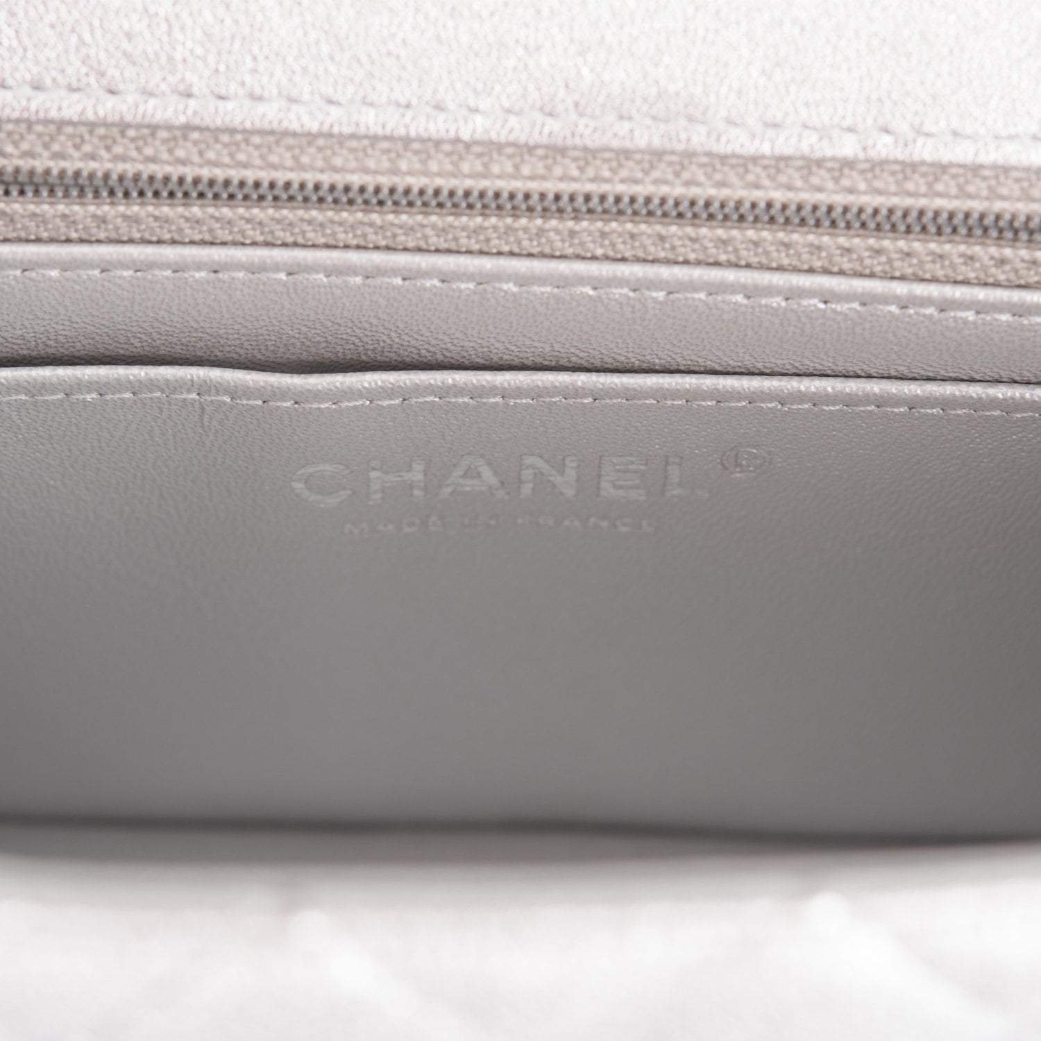 The interior is lined in silver leather and features a zipper pocket with Chanel pull and an open pocket below.