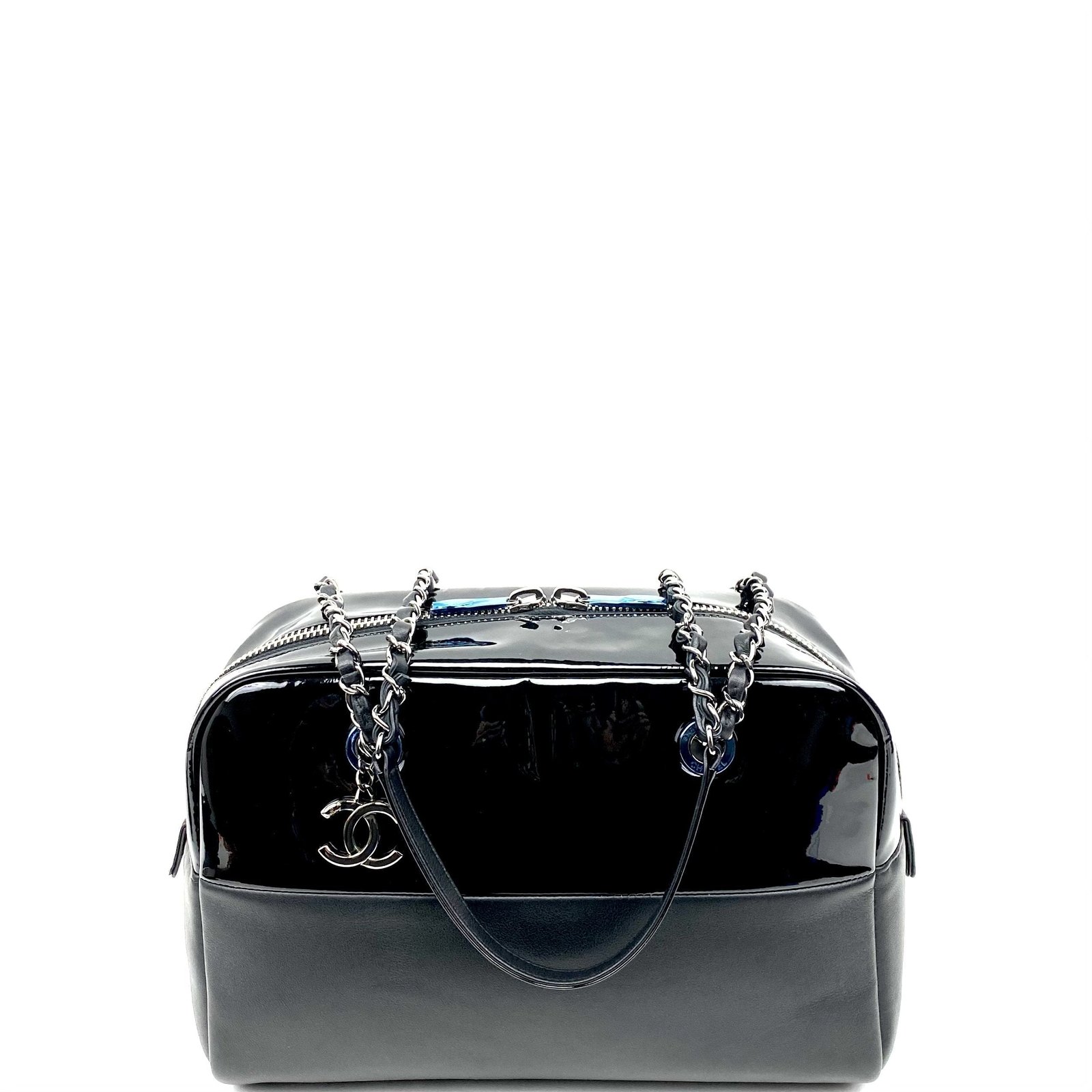 Black Patent & Lambskin leather Chanel Bowling bag with gunmetal hardware, dual chain-link and leather shoulder straps, black grosgrain lining, three interior pockets; one with zip closure and zip closure at top. Includes dust bag and authenticity card.