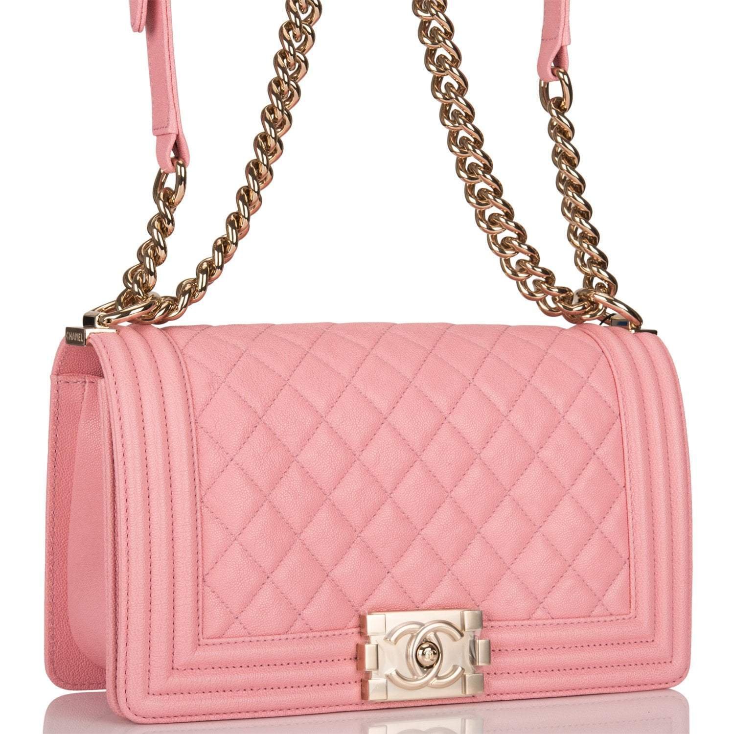 This Old Medium Boy bag is in pink quilted caviar leather with light gold tone hardware and features a full front flap with the Le Boy CC push lock closure and a light gold tone chain link and pink leather padded shoulder/crossbody strap.