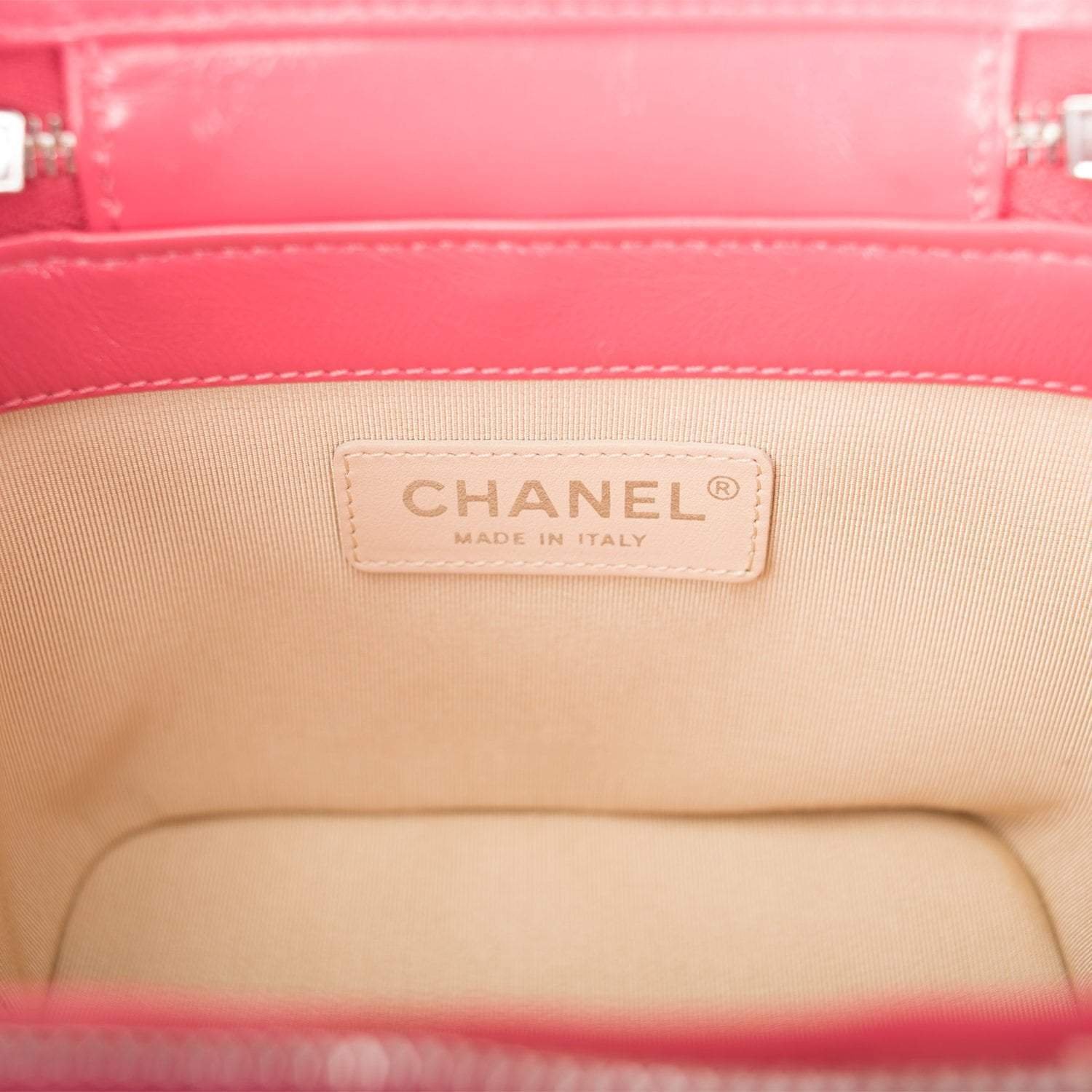 This Vanity Case is in pink leather and rattan with silver tone hardware and features a CC logo on the front, a top handle, and an interwoven silver tone chain link with pink leather shoulder strap.