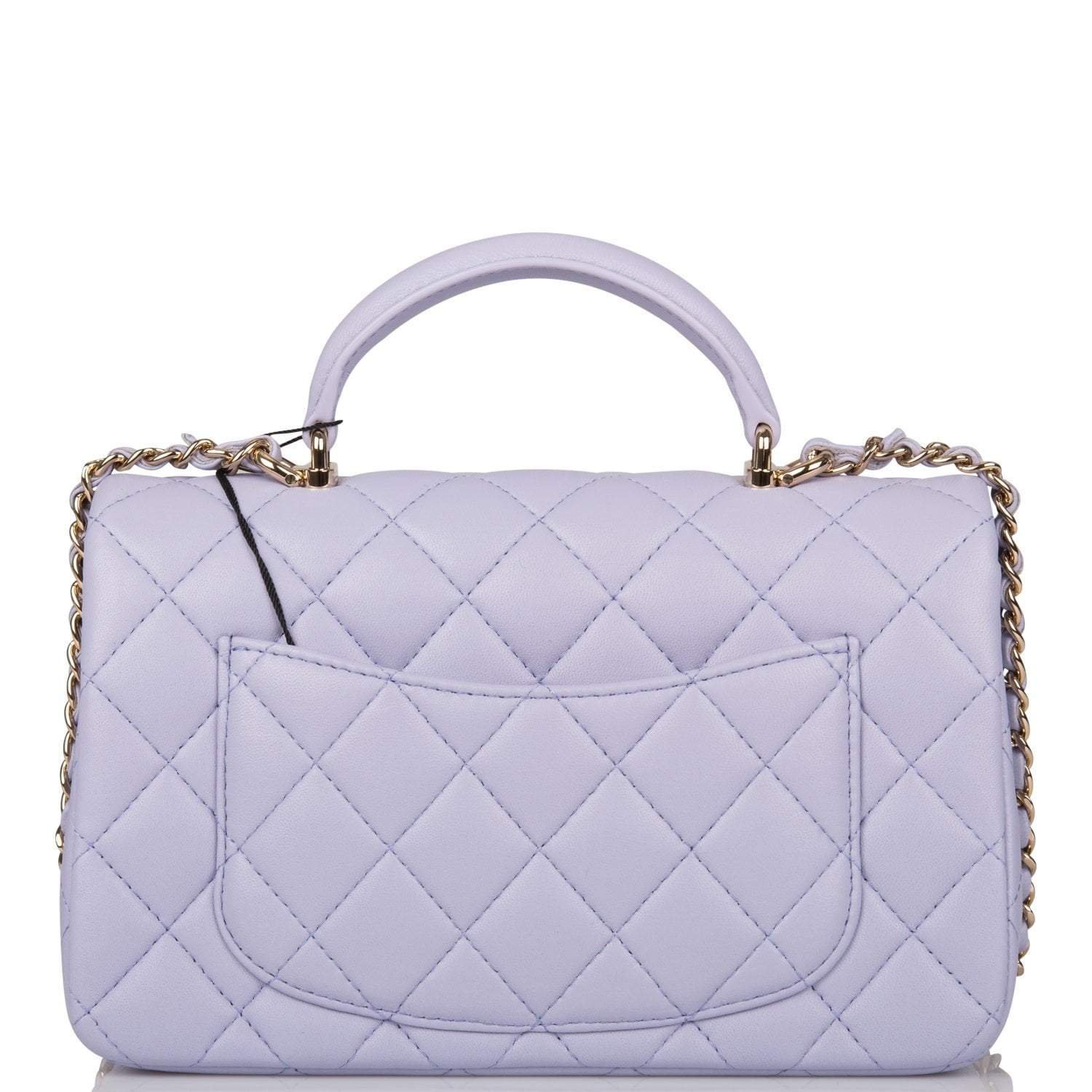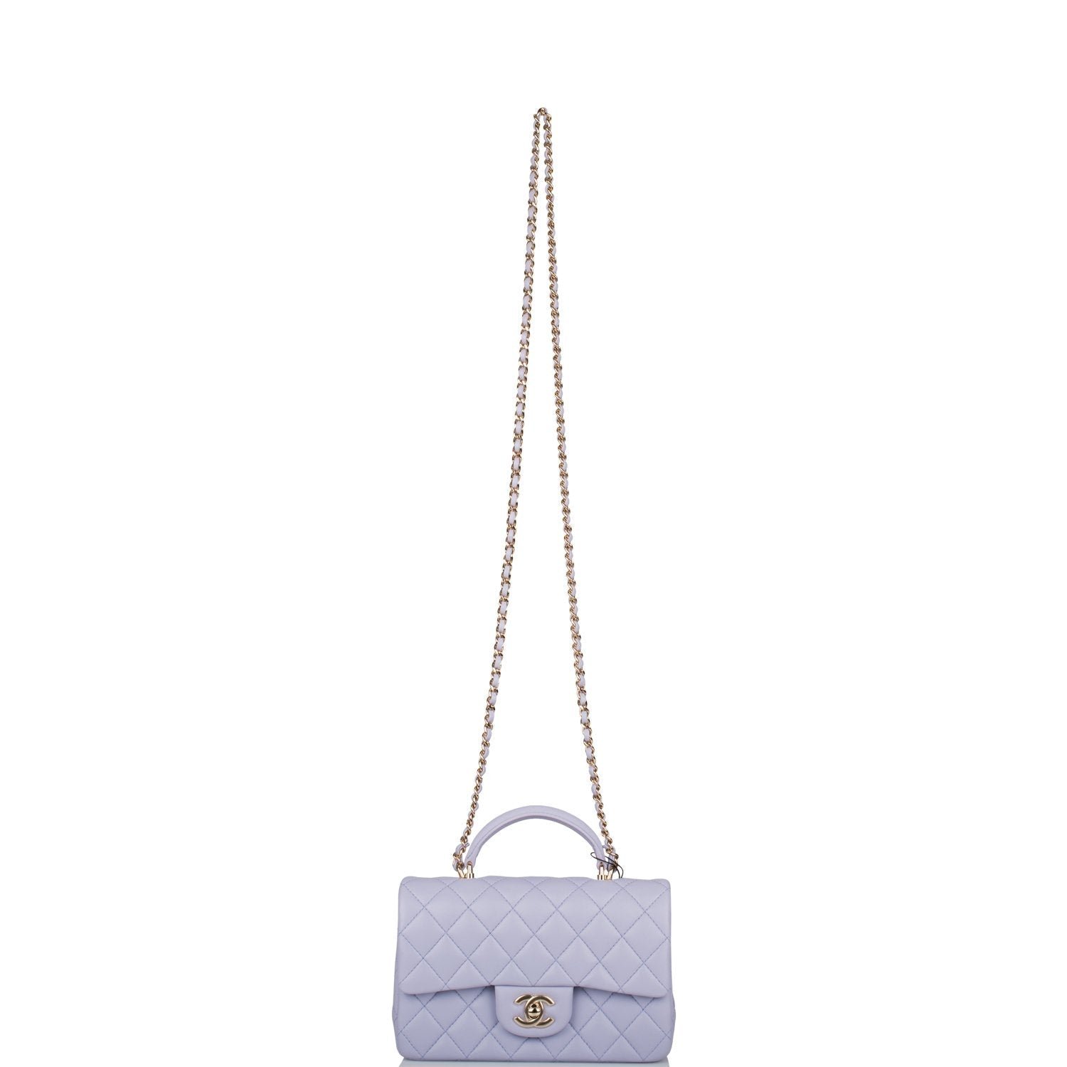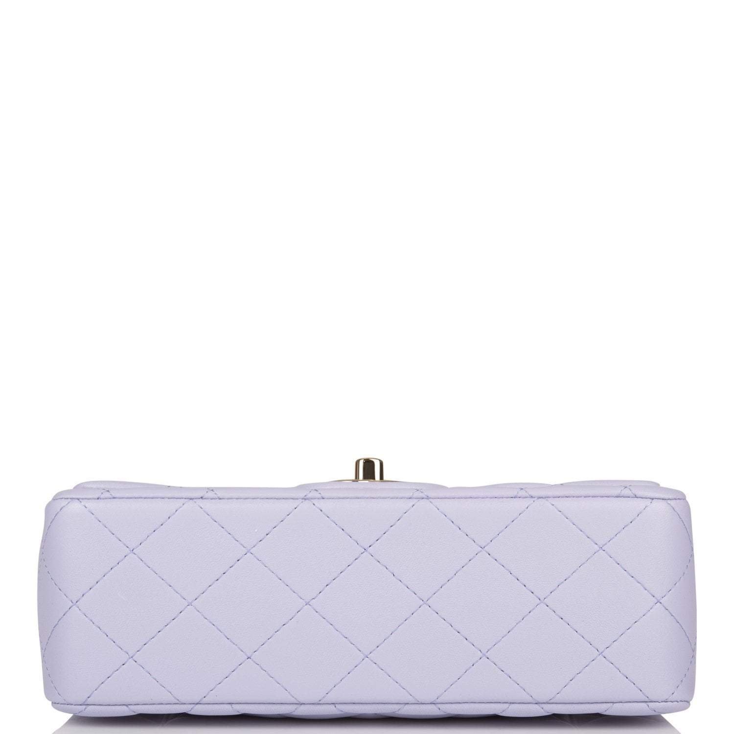 This Mini Rectangular flap bag is in lavender lambskin with light gold tone hardware and has a front flap with signature CC turnlock closure, rear half moon pocket, top handle and single interwoven light purple leather and light gold tone chain link shoulder/crossbody strap.